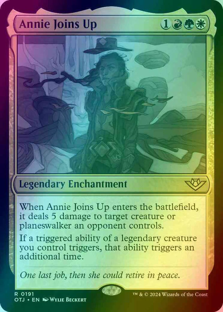 hen Annie Joins Up enters the battlefield, it deals 5 damage to target creature or planeswalker an opponent controls. If a triggered ability of a legendary creature you control triggers, that ability triggers an additional time.