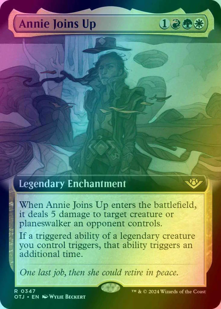 hen Annie Joins Up enters the battlefield, it deals 5 damage to target creature or planeswalker an opponent controls. If a triggered ability of a legendary creature you control triggers, that ability triggers an additional time.