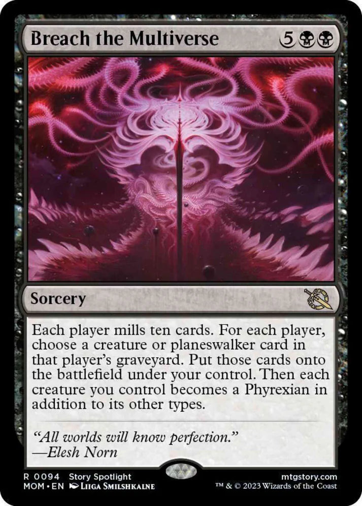 Card Text:Each player mills ten cards. For each player, choose a creature or planeswalker card in that player's graveyard. Put those cards onto the battlefield under your control. Then each creature you control becomes a Phyrexian in addition to its other types.