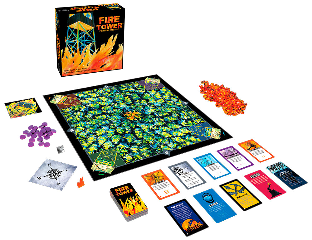 While manning your fire tower you notice smoke in the distance and pull out your radio to report a blaze growing somewhere in the forest. You must protect your tower with all the resources at your disposal: dispatch fire engines to combat the blaze, order air drops of water, and plan the building of firebreaks. Competing fire departments will complicate your work, using the unrelenting winds to their advantage in an attempt to safeguard their own towers and threaten yours. The chaotic Firestorm also stalks the deck and will dramatically swell the flames each time it is drawn. Will you effectively use your forces to outwit your opponents and survive the inferno? Can you be the last tower standing?