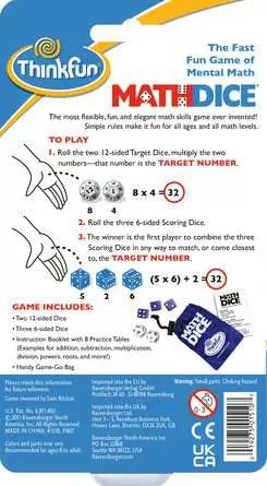 Roll the two 12-sided Target Dice and multiply them to get a target number. Roll the three Scoring Dice and combine these numbers using addition, subtraction, multiplication, division, or even powers to build an equation that is closest or equal to the target. This mental challenge helps players sharpen math skills by solving problems in a fun new way.
