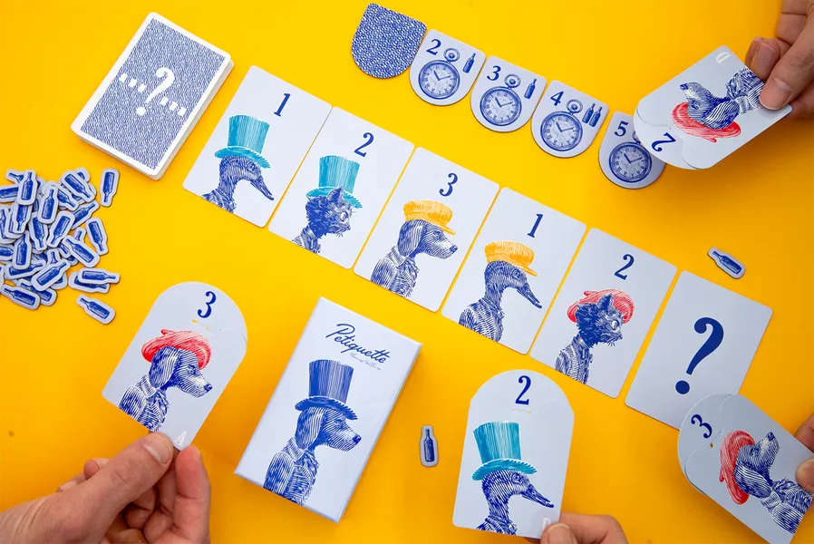 Each round in Petiquette, players look at a line-up of five random cards — with cards showing one of three animals that is wearing one of three hats, with a number from 1-5 at top — and try to find some logic or pattern within them. Each player secretly chooses the card they think would most properly fit into that pattern. For example, if the sequence is "red, red, yellow...", you might feel that yellow should come next. If it's "dog, cat, bird...", then maybe dog feels right...but what about "dog, cat, dog, cat, bird"? No single answer is correct, but if someone chooses the same card as you, you both earn points.