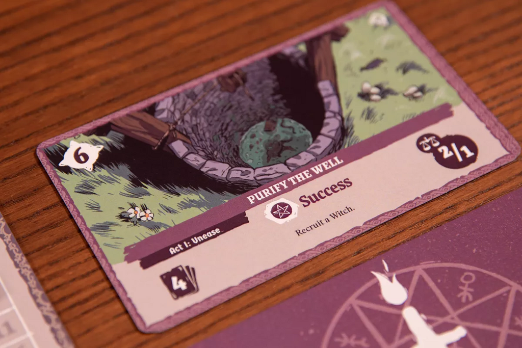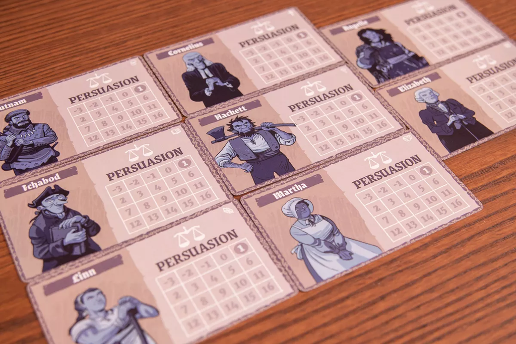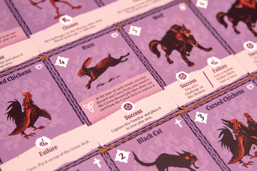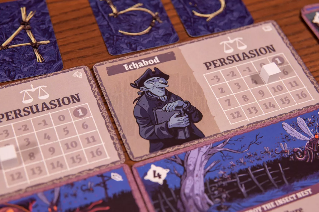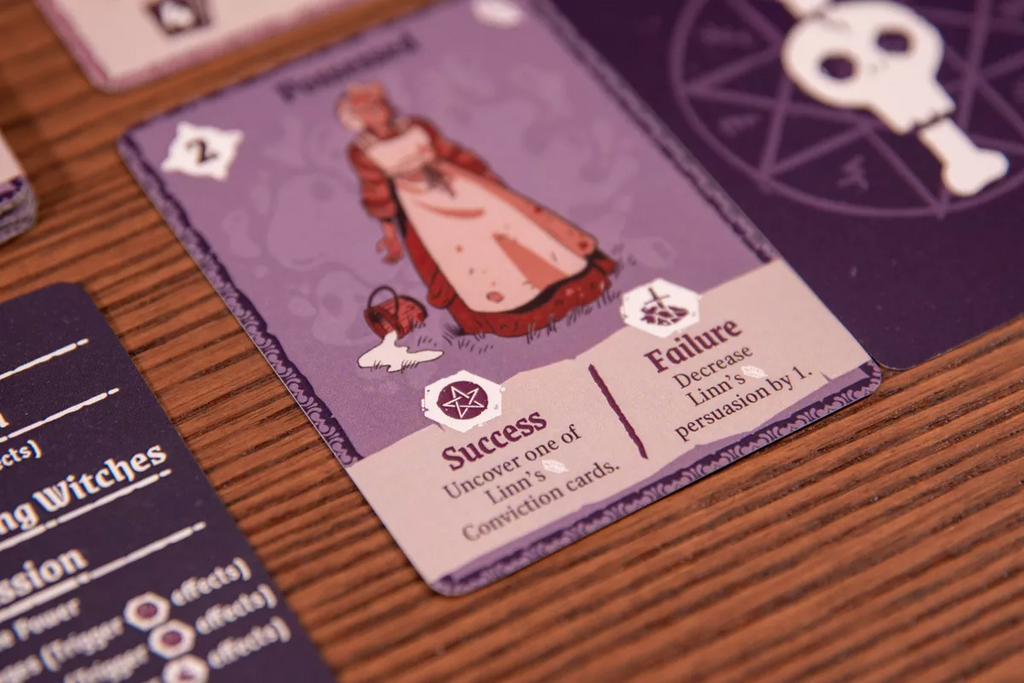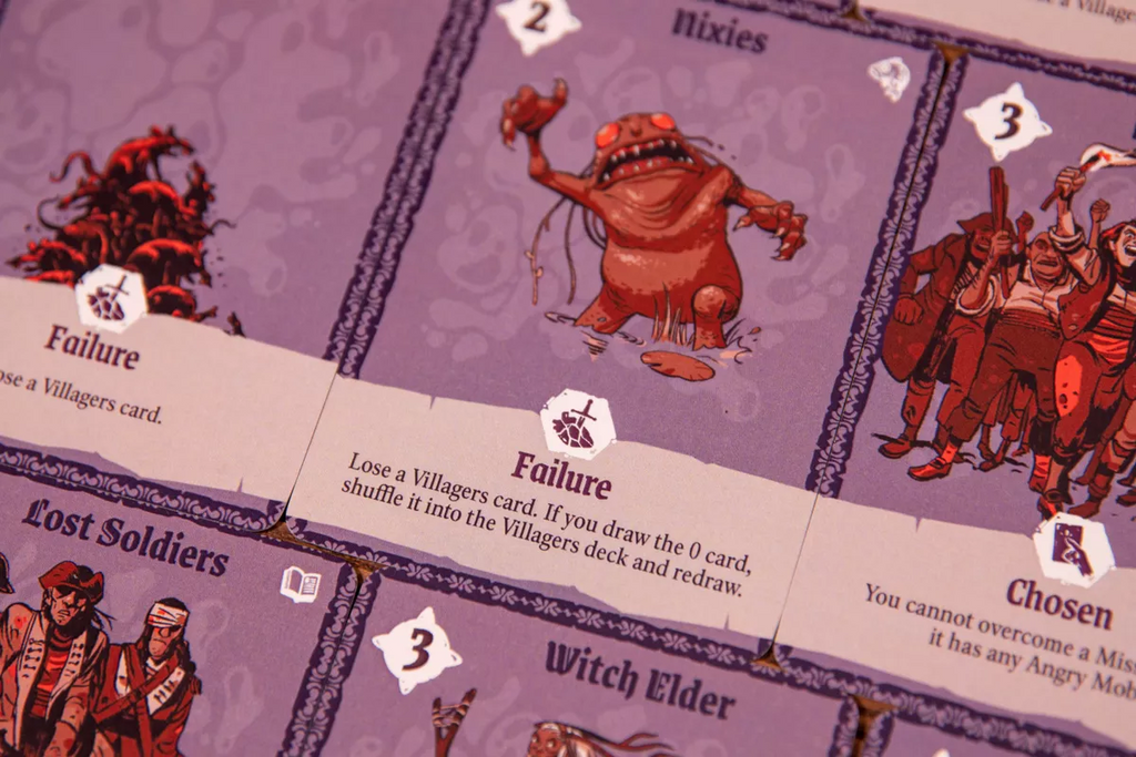 At the beginning of the game you assemble a coven of witches from families of women represented by a deck of cards. Selecting multiple witches from a family makes that family more powerful. Each family is focused on different tasks in the game–revealing challenges, increasing attack power, uncovering the conviction of the jurors, or capturing familiars to help you in your fight. The fight is real and each of the eight jurors face a different villain. Is it the Headless Horseman, Baba Yaga, the Scarecrow, or some other fiend? On setup you choose three jurors, their missions, and their unique challenges–providing 56 possible combinations with great variety in the types of challenges and monsters you will face. If you fail two missions or lose five villagers, you lose the game. Even if you defeat the missions you still face the trial, and you are only sure of your fate when you reveal the conviction of the jurors and see if you have done enough to persuade them.